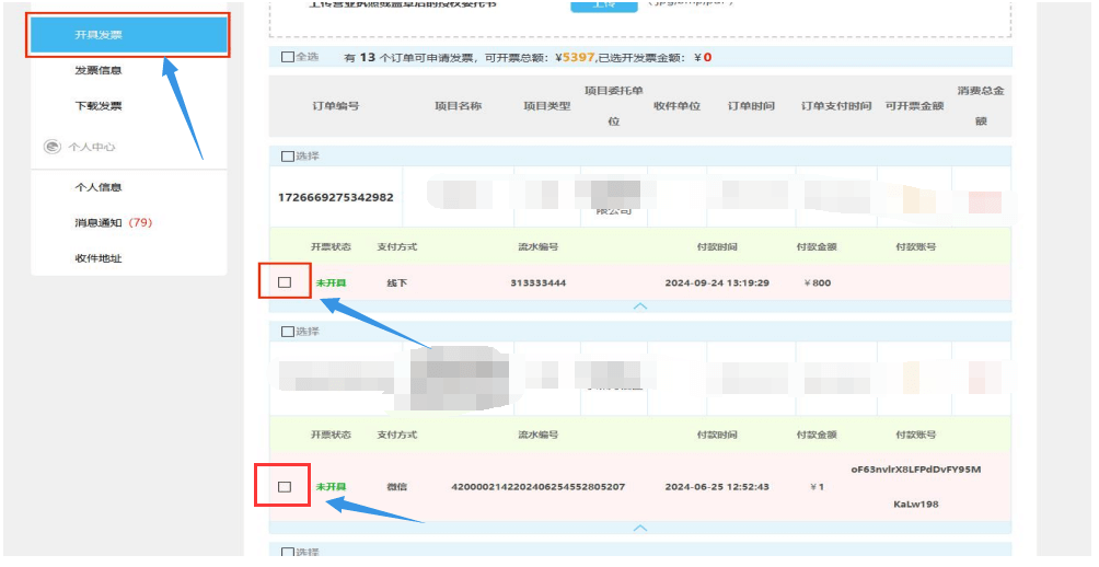 进入我的订单“开具发票”,勾选可以开票的订单, 如果需要多份委托开一张发票,请同时勾选需要开票的订单,一起提交申请, 如需要分开开具,请分别提交“开具发票”申请每张发票开具后只能重开一次,请仔细核对发票信息