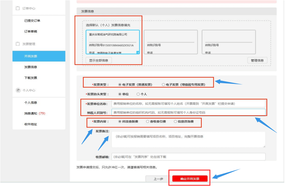 根据财务需求选择开具发票类型,发票内容,填写开票公司信息