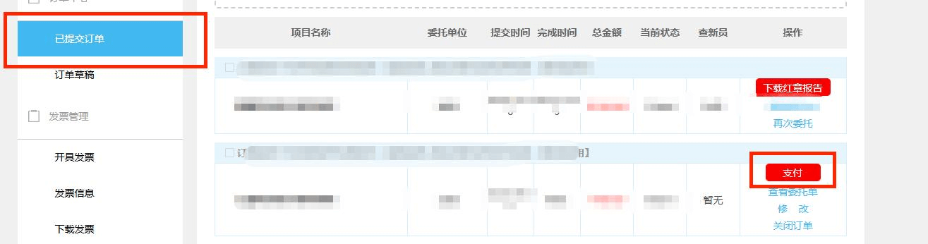 (1)登录平台,点击我的订单,通过“已提交订单”里项目名称或查看委托单进入订单详情页面;
