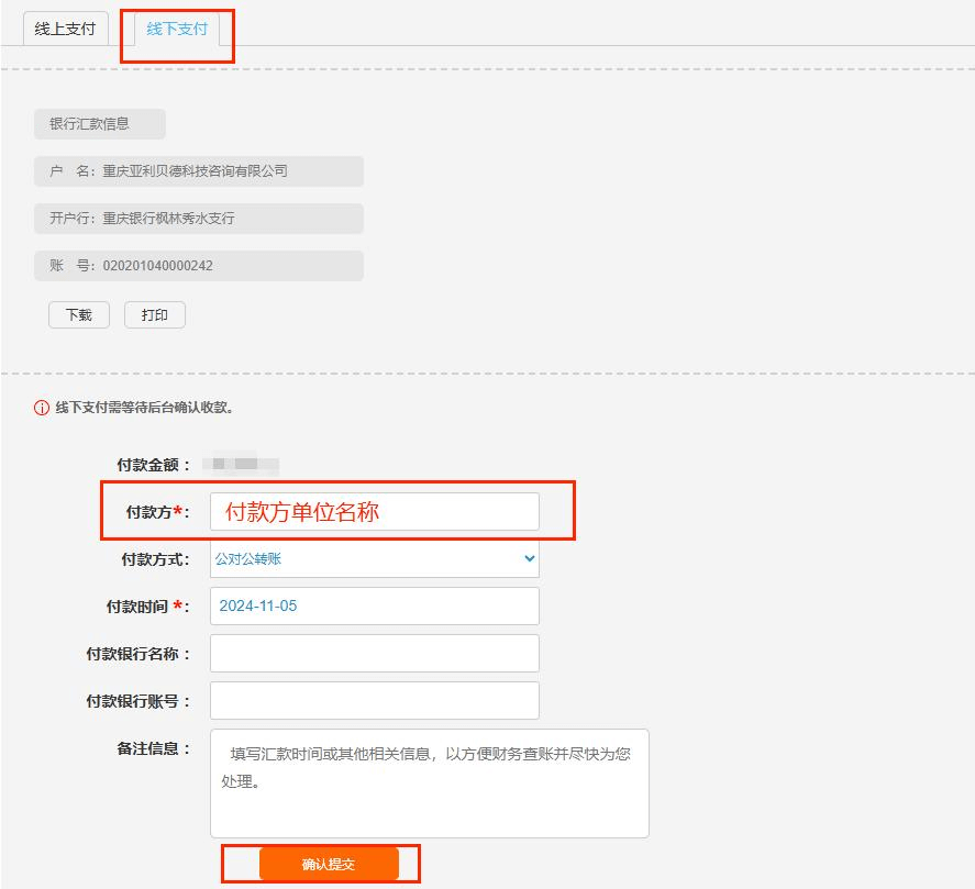 3、进入支付页面后,选择“线下支付”,填写“付款方”信息后点“确认提交”