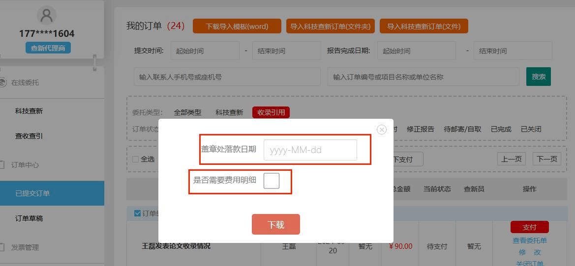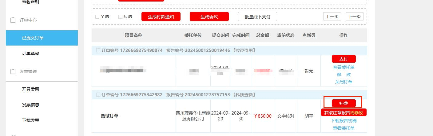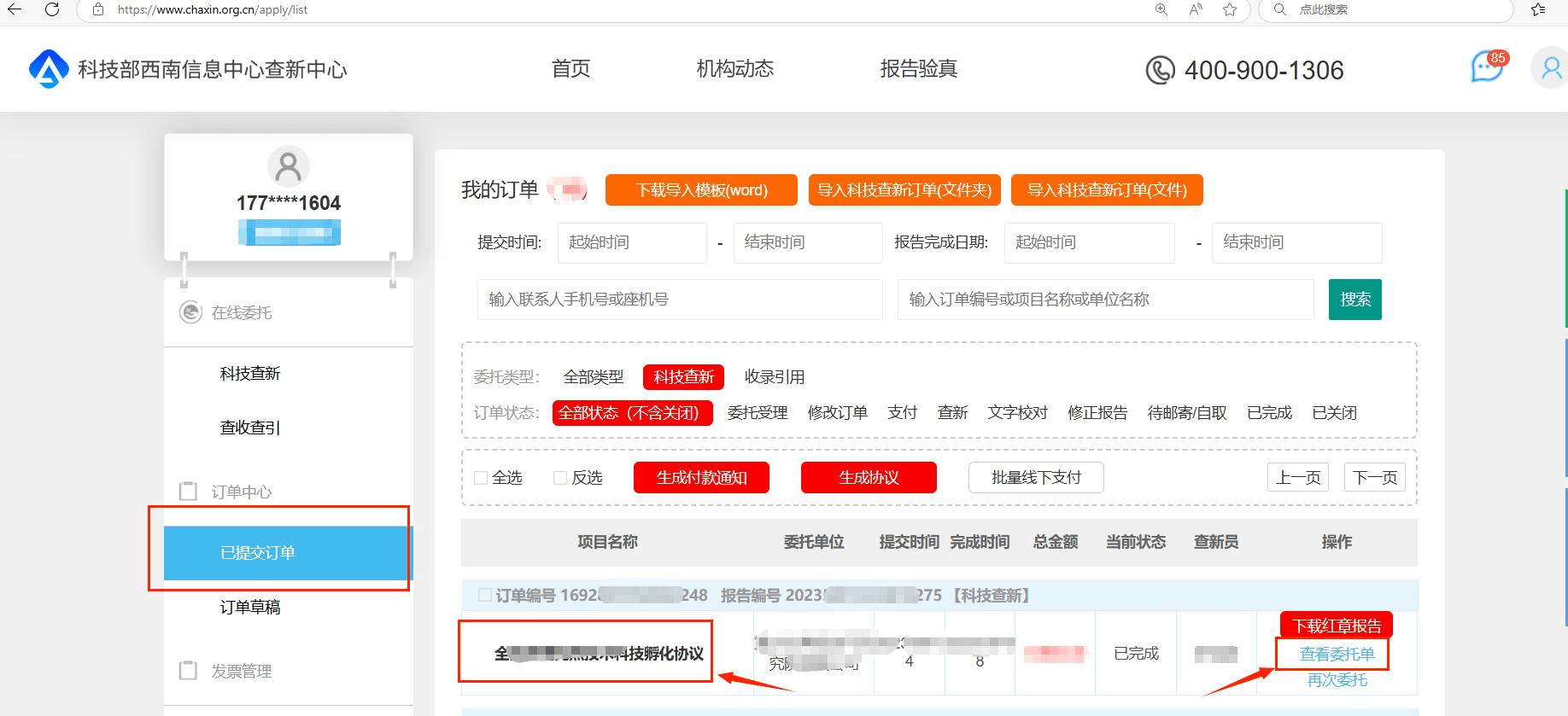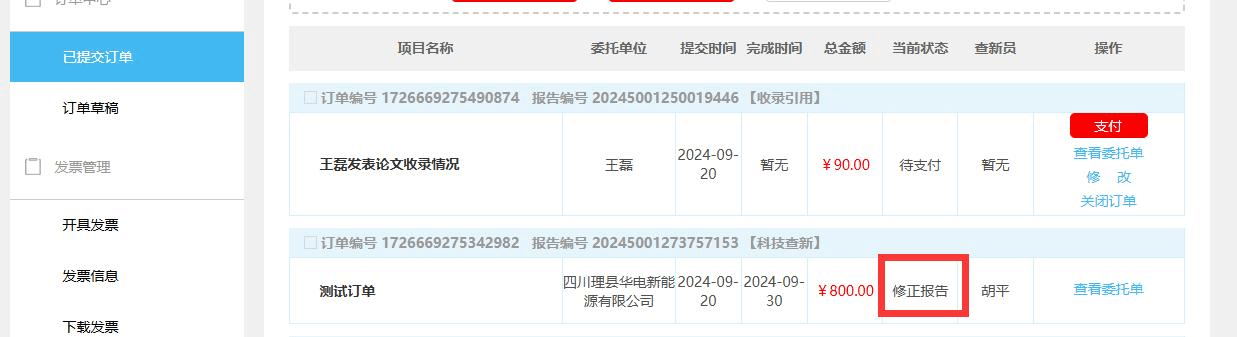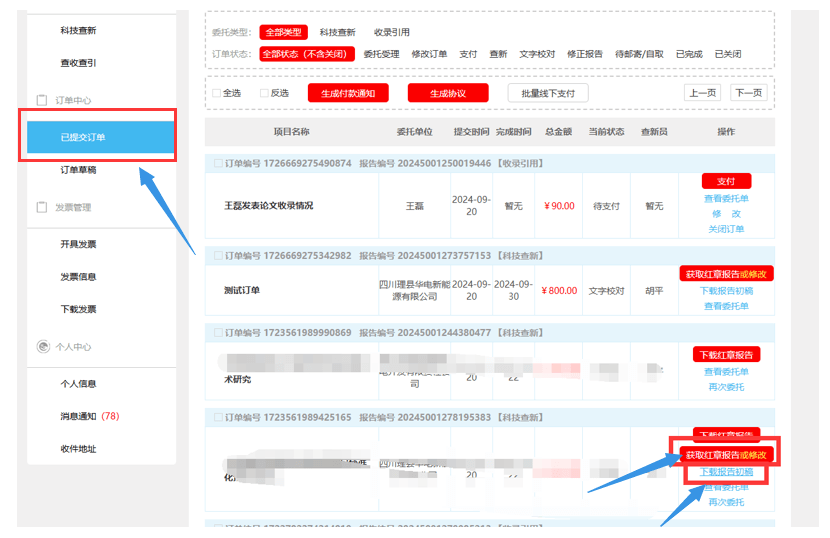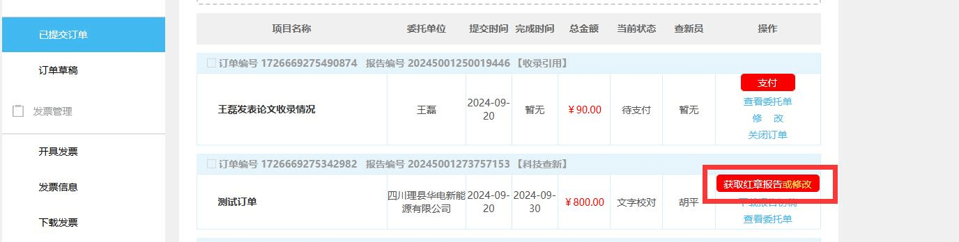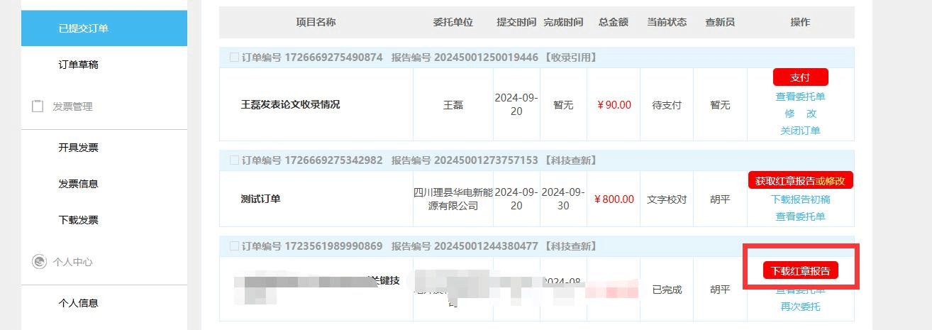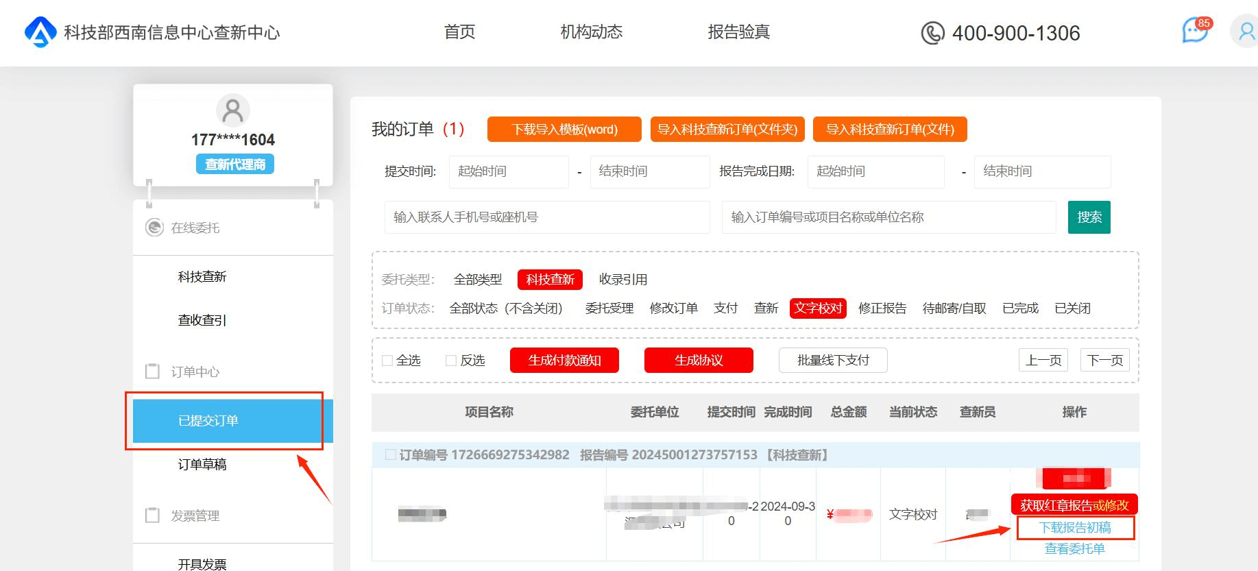 (1)登录平台,点击已提交订单,下载报告初稿对初稿进行文字校对,主要是确认项目名称,有无错别字,结论是否为“未见相同文献报告”