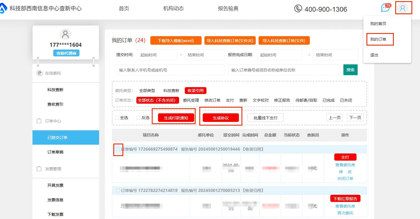 1、登录平台,点击我的订单,勾选需要合作协议或付款通知书的订单,点击“生成付款通知书”或 “协议”