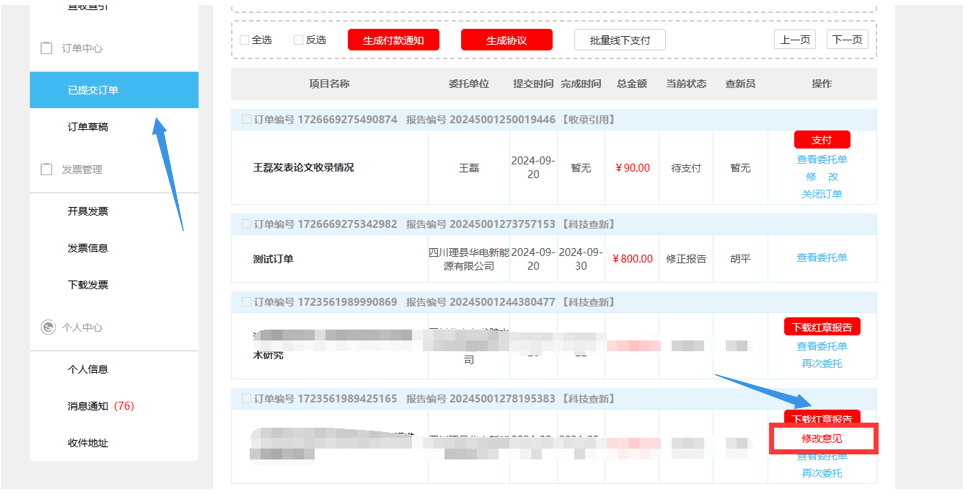 (1)登录平台,在已提交订单页面找到需要修改的订单,点击“修改意见”