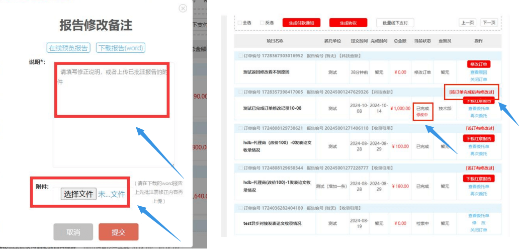 (2)在说明框填写修改意见,或者上传修订模式的word文档,提交修改,订单状态为“修改中”