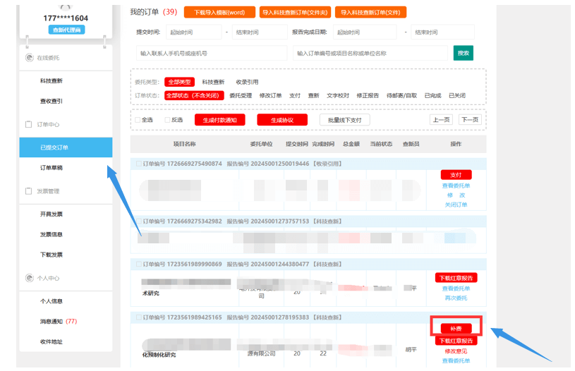 (3)修改需求提交后查新老师接受需求,评估是否可修改,如修改涉及补费的,请登录平台进行补费操作
